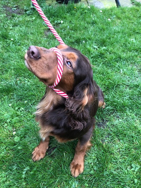 Handmade 100 % pure Cotton 10 mm figure of eight dog lead which helps to train dogs to stop pulling while on a walk. It is fitted with 2 adjustable loops with a leather stopper to fix it into place. This is best for medium to large dogs & it is soft but very strong. Washable with Instructions included. UK sourced quality materials. FREE UK DELIVERY. 10mm Pure Cotton Quality Figure Of Eight/ Handmade Anti-Pull Slip Dog Lead With A Leather Stopper. Adustable