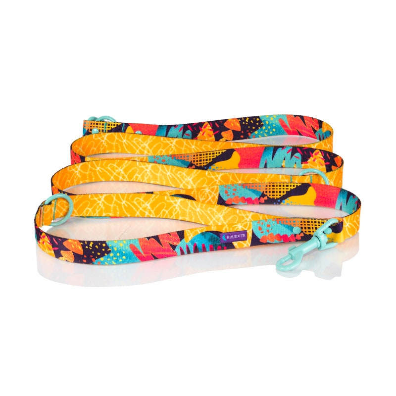 Choose the size & color of fittings/hardware for your own personalized collar – you can create your own product by choosing hardware (hardware = carabiners) in different variants. We use 7 juicy colors: – rose – yellow – black – mint – azure – red – violet Which width to choose? – we recommend 4/5” (2 cm) for small & medium dogs & 1” (2.5) cm for large dogs DO NOT FORGET to add a note to the order with information which one you have chosen. Adjustable leashes are a good solution for dogs whose goal in life is to explore every corner of their everyday walking route – & beyond! It is much longer than the urban leash (2.5 & 3 meters), but the distance between the handler & the dog can be easily regulated depending on whether we wish to accompany them ALL the time or to give them some privacy. Webbing Our webbing is soft, light & super-strong. We imprint our designs with dye-sublimation printing so the colors will be strong & probably outlast mankind 🙂 Rivets We use two-sided, metal sewing rivets which are originally produced to sew together leather & thick fabrics. They can withstand large weights & the healthy haul of well bread large human male right after a hefty dinner with desert 🙂 If you are unsure about the lenght or width, please contact us. Adjustable Miami Disco Webbing Dog Leash, Personalized Soft Light Watercolor Splash Lead, Lover Gift