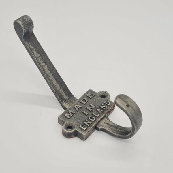 Antique cast iron coat hook featuring Made in England legend. These hooks are ideal for hanging coats, jackets, dog leads etc & bring a traditional quality look to any setting. Specification Legend: MADE in ENGLAND Antique style, vintage look Cast iron Many other similar designs available Size approximately 100mm x 50mm Additional features All our items are completely unique designs or re-manufactured copies of old original castings. Unlike much of the mass produced ironmongery available today, our authentic hardware is traditionally crafted through a sand casting process & goes through five stages of hand finishing to achieve a natural authentic, living finish. When exposed to moisture directly or in high humidity Cast Iron is susceptible to rust, however light surface corrosion can easily be removed with wire wool & protected with a lightly oiled or waxed cloth. in extreme conditions such as outdoors we recommend applying a suitable finish such as lacquer or paint. Antique Style Cast Iron Coat Hook Made in England
