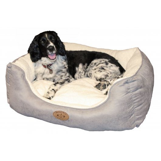 This is a soft touch dog bed designed with a faux sheep fur outer lining to maximise warmth and extra comfort. The removable cushion inside the bed enables the user to easily wash the cover separately and also a reversible second colour option. To ensure as not to damage the filling, the outer ring of the bed is hand wash only. The front of the bed is branded Banbury andamp; Co with an attached PU badge. Sizing: Large – 80 x 65 x 25cm Good fit for: French Bulldog/Pointer/Springer Spaniel/Cocker Spaniels. Extra Large – 90 x 80 x 25cm Good fit for: Boxer/Bulldog/Labrador/Retriever/Dalmatian/Greyhound/Basset Hound….