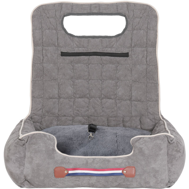 Features: Solid Dog Bed: The whole bed constructed with grainy suede fabric, which makes it look stylish and feel soft in hands, anti-wrinkle, provides a comfortable place for puppies to sit on and snooze. 600D anti skid rubber dot bottom, prevent from slippage during use Removable Cushion Pad: The cushion is made of grainy suede and linter fabric, feels soft and warm, also stain resistant. Enough PP filling for extra comfort, not easy to sink down when they seat on. It’s strongly fit into the bed with button. The cushion cover is zippered, easy to clean Car Seat Carrier Bed: Not only used as a car seat carrier bed, but also a dog bed in the home. Equipped with safety seat belt clip, attaches to dog’s collar, the bed effectively keep the puppies stay on the seat, keep them calm and secure, prevent running Smart Design: The car seat bed has a zipper pouch on the front for easy storing your dog food, snack, garbage bag and stuff. Front PC handle for you can easily take the carrier out.