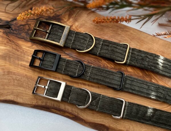 This handcrafted green corduroy dog collar is made in Wiltshire uk Green Corduroy Dog Collar, Optional Matching Lead Available