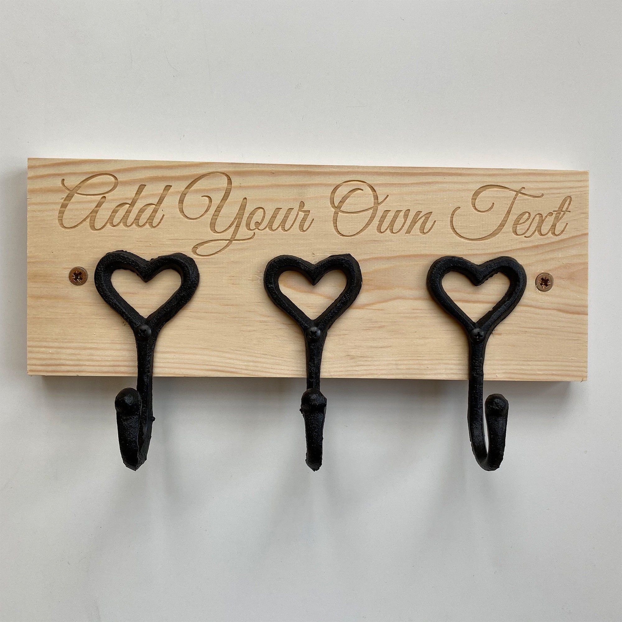 Coat rack with 3 cast iron heart-shaped hooks The pictures are of a finished item. Each one is cut to size, hand-sanded, laser engraved & finally the cast iron hooks added with drilled holes either side ready for fastening to a wall, door, etc. It also comes with 2 wall plugs & screws. These look great as they are or you can paint / wax / varnish them. Laser engraved in great detail these make unique coat racks for any home with a nice clear engraving of around 1mm deep Approx size is 31cm by 11.5cm (12 x 4.5) & it sticks out with hooks 7.5cm (3) Usually dispatched within 2 to 3 working days. If your looking for something similar but would like a different engraved design like hearts, fairies or size, please let us know & we may be able to make a custom order. All our wood is FSC certified & from sustainable sources. There may be some knots on your wood which is perfectly natural & adds character. If you specifically do not want any knots, please add a note to your order. The wood that is used is European Redwood so these are suitable for use outdoors with no additional treatment required if you wanted to hang garden tools, dog leads or other items. The packaging we use to ship these is all 100% recyclable Shipping UK delivery times are 2-3 working days Europe 3-5 Business Days Rest of the world 5 – 7 Busines days (sometimes delays do occur due to customs. It is rare but if your item is late it is most likely delayed by customs checks.) Canada & Australia – If you are ordering from these countries, please allow some additional time for delivery. Heart Hook Coat Rack, Kid’s Clothes Personalised Wall Hooks, Room Nursery Decor 31 X 11.5cm | 12 4.5