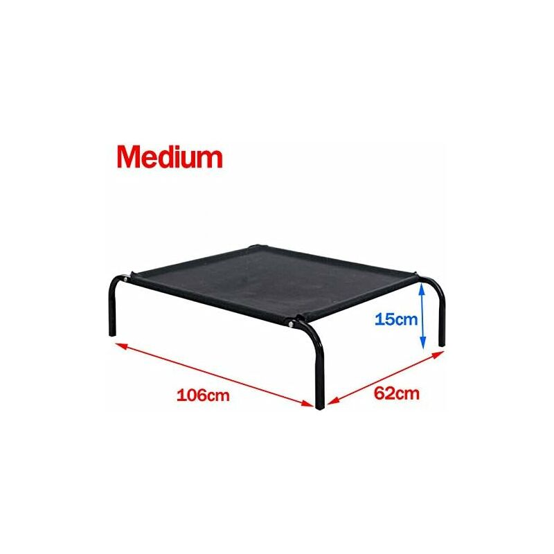 Specifications: The powder coated steel frame on Dayplus elevated pet bed for cats and dogs is made not to rust, even if the raised bed is used outdoors for extended periods of time. The breathable and high-density mesh helps prevent hotspots which is good for summer days. In winter you could use put a blanket on the bed and help the pets leave the cold floor away. To have our dog bed raised from the ground helps prevent joint pain for senior dogs and dogs with bone disease, and the portable design allows you bring it for outings and trips. These off the floor dog beds are instant favorites in many puppy owning homes. Features: Off-The-Ground Design Durable Mesh Quick And Easy Assembly Stable Steel Framework Non-slip Feet Stress-Free Cleaning Indoor And Outdoor Use Heavy duty material will support up to 50kgs Size: Small75cm x 47cm x 15cm, 30x19x6 Medium106cm x 62cm x 15cm, 42x24x6